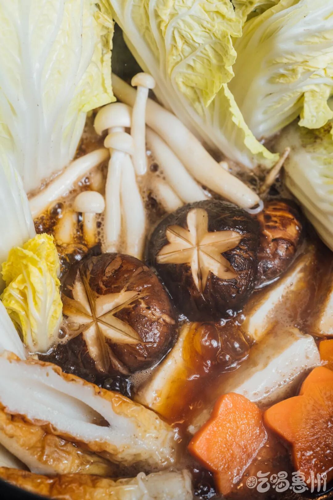 寿喜锅的配菜很丰富,牛肉吃饱之后倒下青菜汁,就可以开始一锅炖。锅里有什么,全凭喜好,反正怎么煮都很好吃。