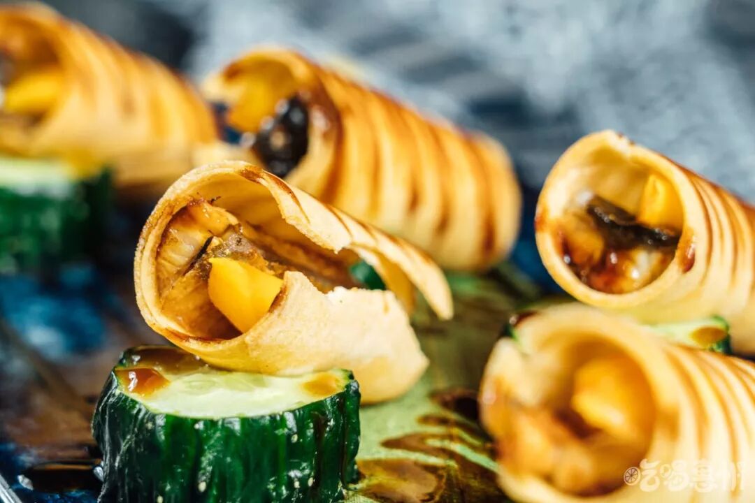 外表形似蛋卷,名字很文艺,摆盘也是精心,每一个都垫了高度相似的青瓜垫。
