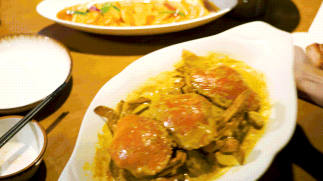 每天都必须保持膏蟹新鲜到店,所以卖完就没有了。过油/咖喱翻炒,师傅熟练地掌握着火候/调味。坐等的就是肉蟹爆汁的香甜扑面而来~