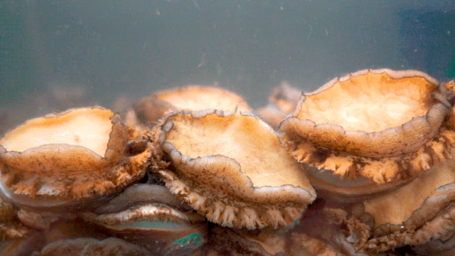 比年糕手掌还大的鲍鱼,一入水就缩在一起。吃过鲍鱼的都懂,一口咬下口感Q弹无比,在汤水的洗礼下,超级有嚼劲。