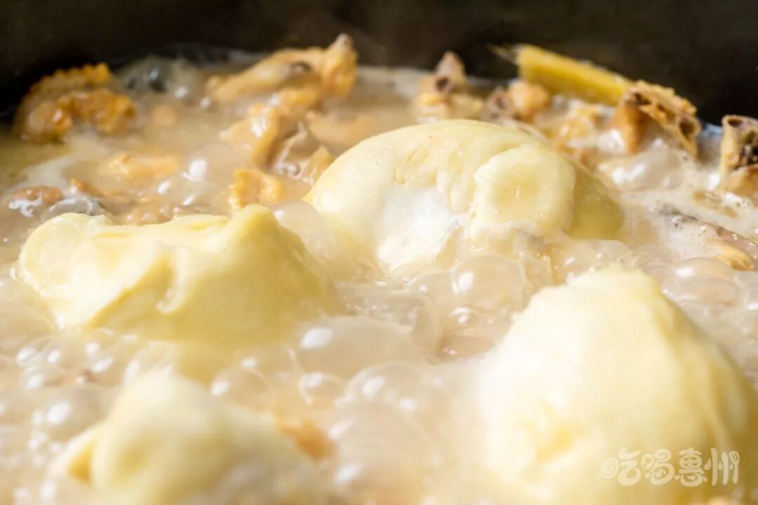 在高温的滚烫下,榴莲不一会儿就软成泥状,想吃完整榴莲肉,就赶紧在汤滚之前捞上来啦。