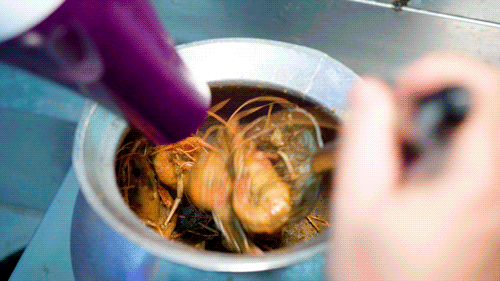 用料是泰国罗氏虾,个头很大,虾肉非常饱满。为保证新鲜,每一份胡椒虾都是现点现杀的,开边、热油、胡椒、吹风机…一份香喷喷的胡椒虾就端上来了!