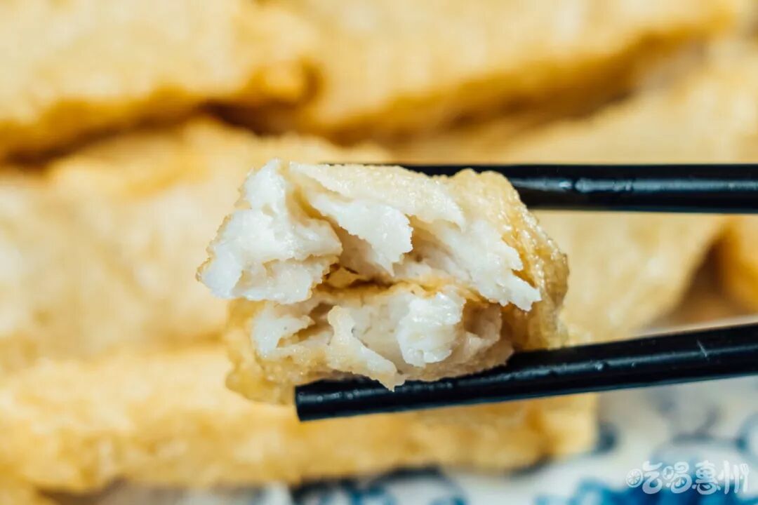喜碧的煎鱼饼鱼肉肌理打得很严实,口感非常嫩,有点像千页豆腐的感觉,蘸酱后更解腻。