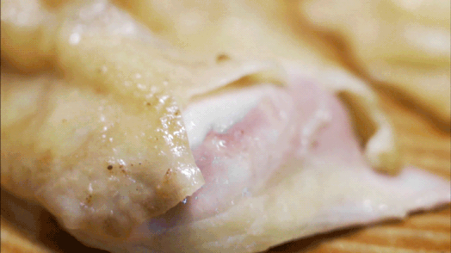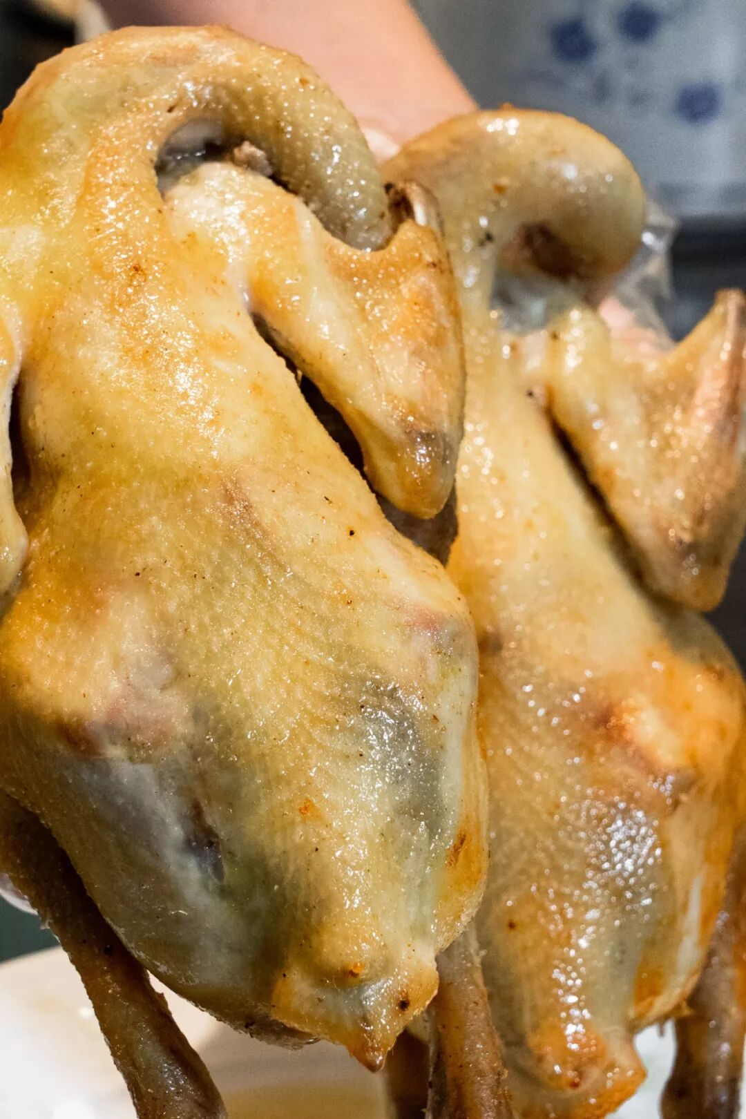 用香料、酱油等独家秘方提前腌制,并对其进行特殊”按摩”,使得鸡的每一寸肌肤都如此紧实嫩滑!