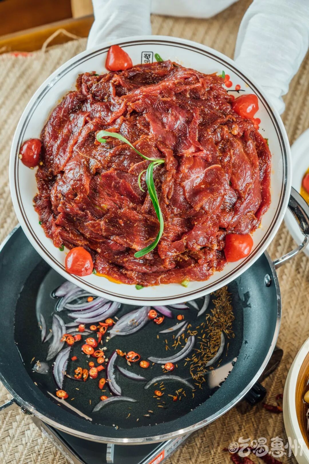 在有钵友味,还可以尝试自己下厨的乐趣。一菜两份,铁锅里放了洋葱、小米椒、牛肉酱、豆油、孜然,想吃时点火开炉就是。