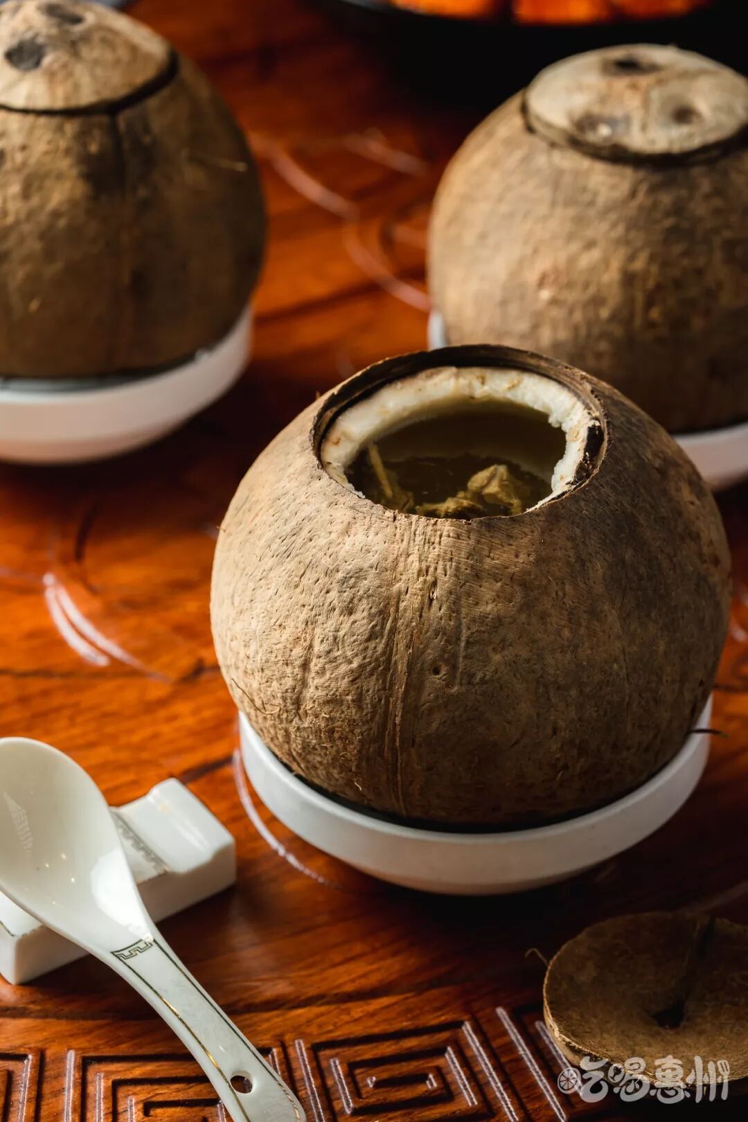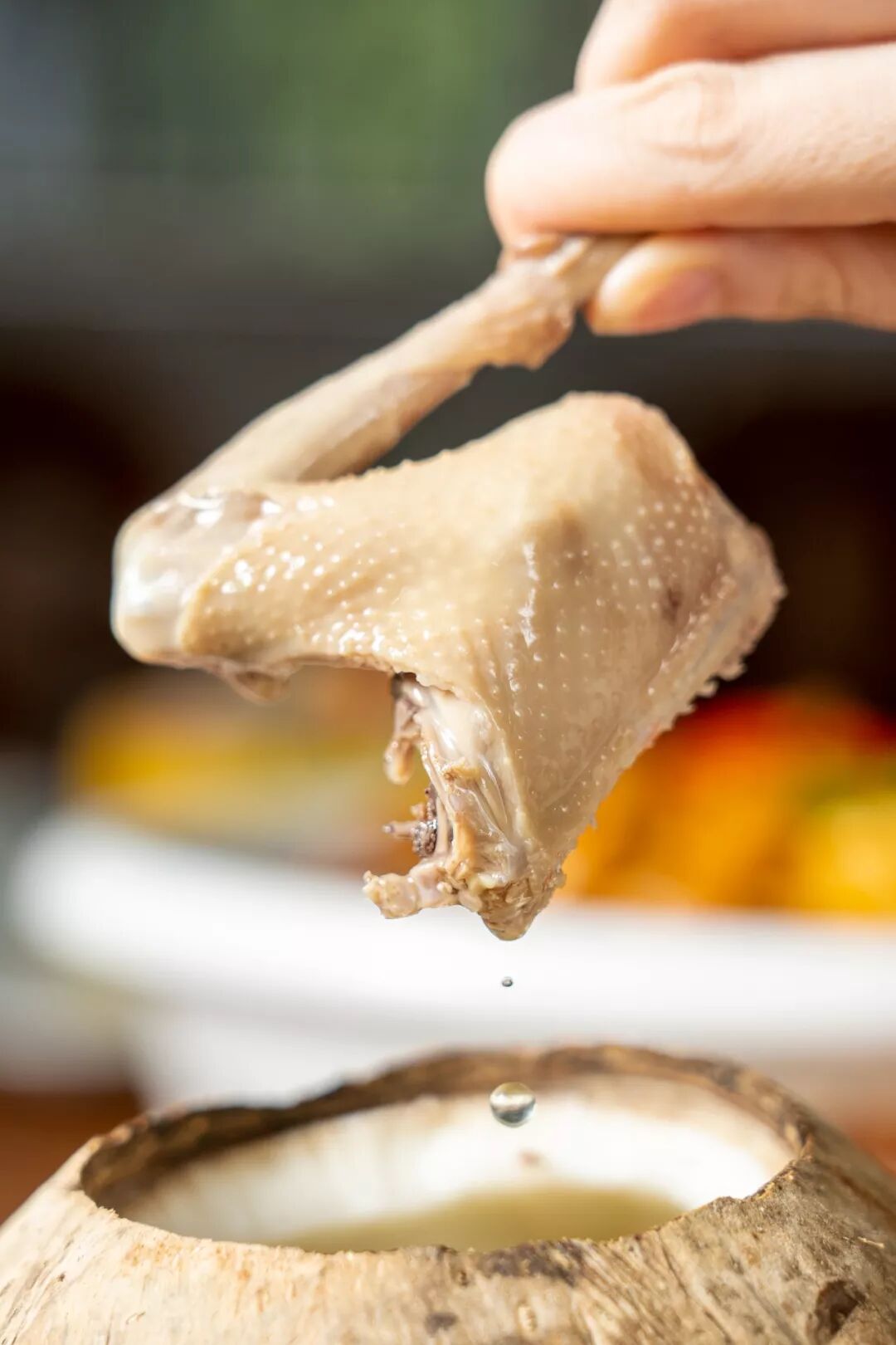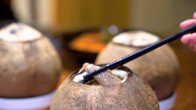 用一整个新鲜椰子锁住鸽鲜,大火将椰汁完美熬进鸽肉里,熬得软滑如泥,轻轻一夹,肉就能从骨头上顺下来。