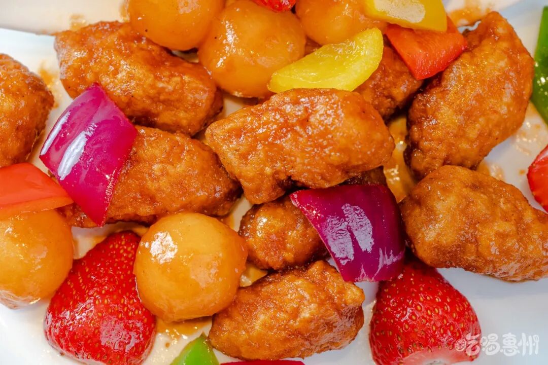 混合了哈密瓜、 草莓、红绿黄椒做点缀的水果咕噜肉,鲜艳的色彩看起来就很好吃,闻起来是酸酸的醋的味道,特别开胃。