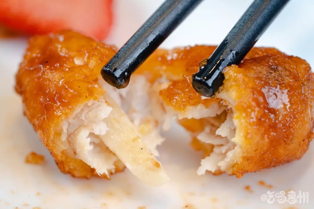 香芋被切成菱状,外表均匀细密地裹满了酱汁,咬开后里面香芋的粉嚅就在口腔里散开。