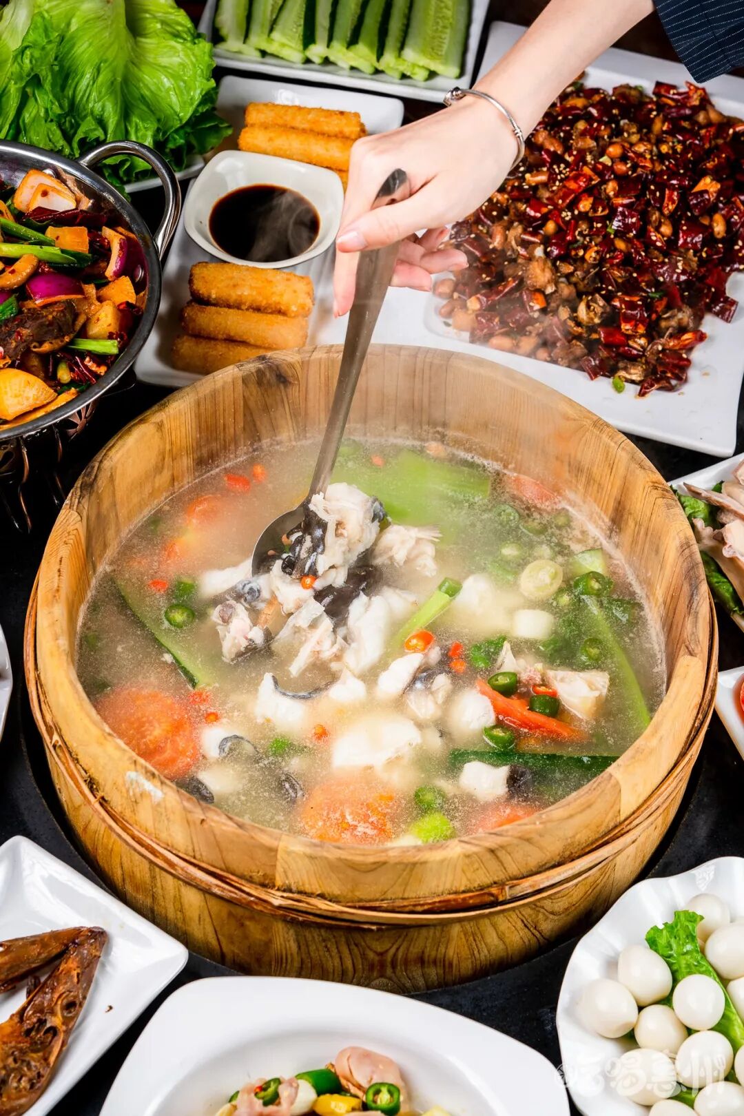 吃木桶鱼,选用的是香杉木木桶,在高温下,香杉木能分泌消除人体疲劳的酶,整份木桶鱼吃起来,健康养生又不失美味。