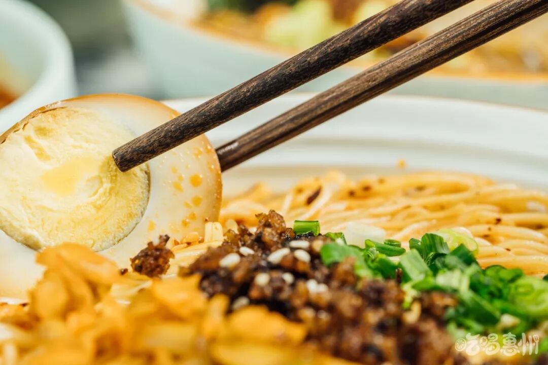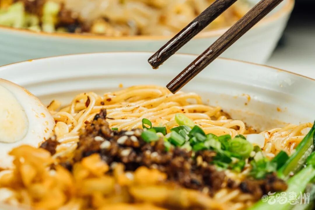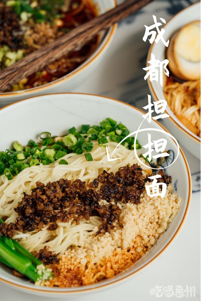 成都的担担面相信很多人都不陌生,它是著名的成都小吃。用面粉擀制成面条,煮熟,舀上炒制的猪肉末、撒上葱花佐料配制而成。