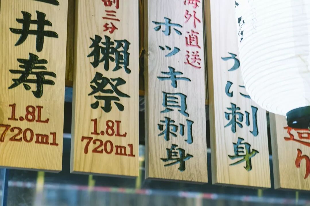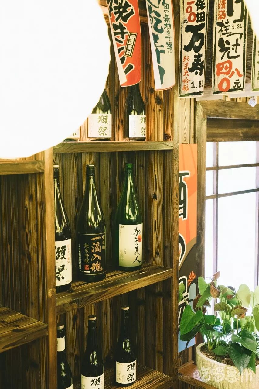 「各式清酒」小屋的墙柜上摆满了各色酒饮,来到居酒屋,怎么也能找到一种适合你的酒。