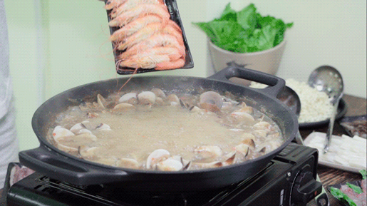 为了避免鲜虾在桌上活蹦乱跳,师傅事先将虾汆烫好,我们只要下锅加热就能吃;新鲜的鱿鱼须,下锅等待两分钟即可~