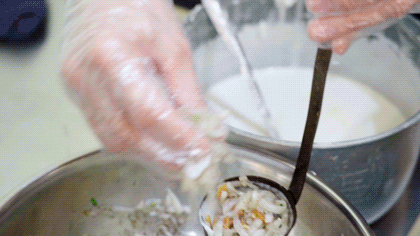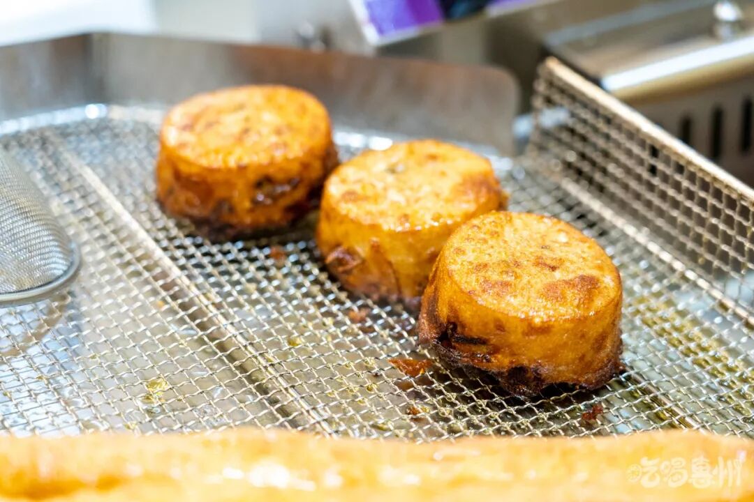 阿嬷叫以酥、香、脆、实而闻名的惠州地道小吃,用特殊的器皿将萝卜馅料压实,浇上米浆,放进滚烫的油锅里,瞬间香气就上来了。