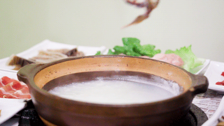 通常一锅粥刚开始会先下海鲜,第一轮涮菜结束后,可以下些素菜,要一碗粥喝,这时候的粥吸收了海鲜的鲜甜,暖胃舒服。