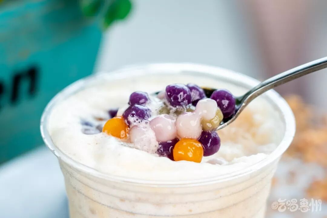 Q弹饱满的黑糖芋圆,搭配浓郁清香的乌龙茶,搅拌后口感圆润饱满,香气甜蜜而又温和,俘获许多惠州少女挑剔的味蕾!