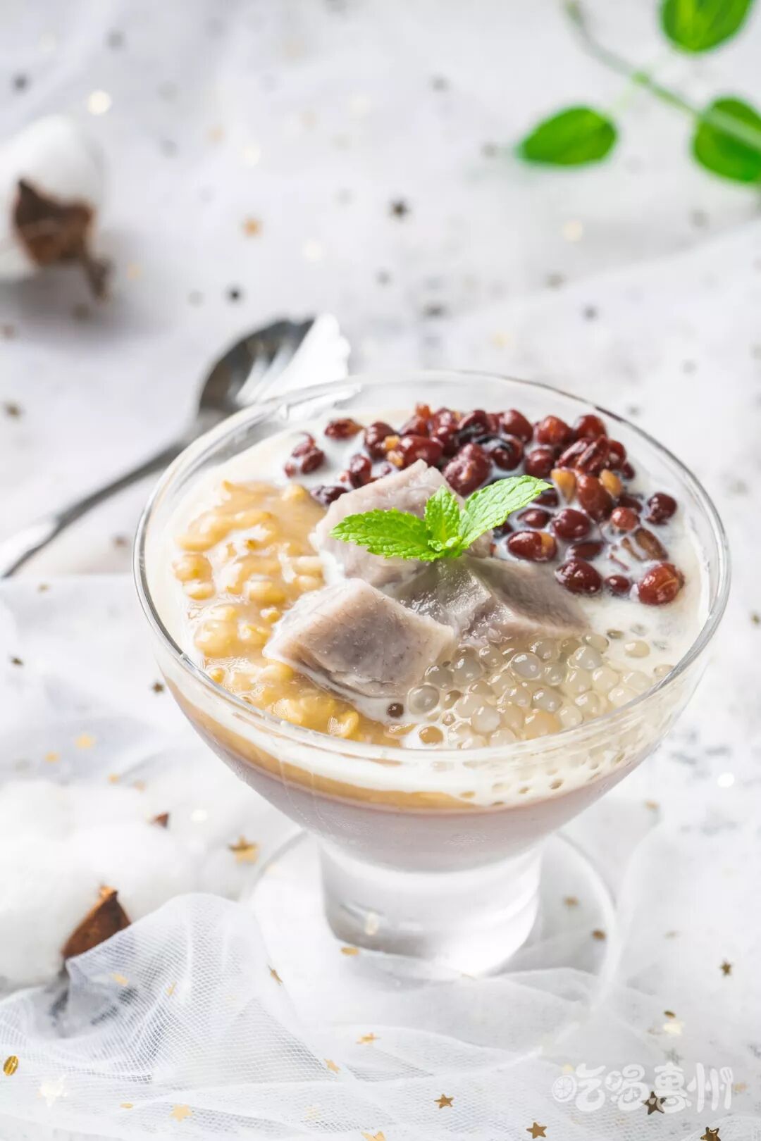 紫米布丁搭配了燕麦、香芋、西米、红豆,均衡的搭配,吃出健康的你。