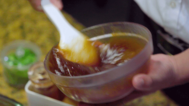 打酱 ░ 打酱是个技术活,一碗膏状的秘制酱料和一把勺,开始搅拌,时间太长会稀,太短会太稠,打到拉起时如瀑布状即最佳!
