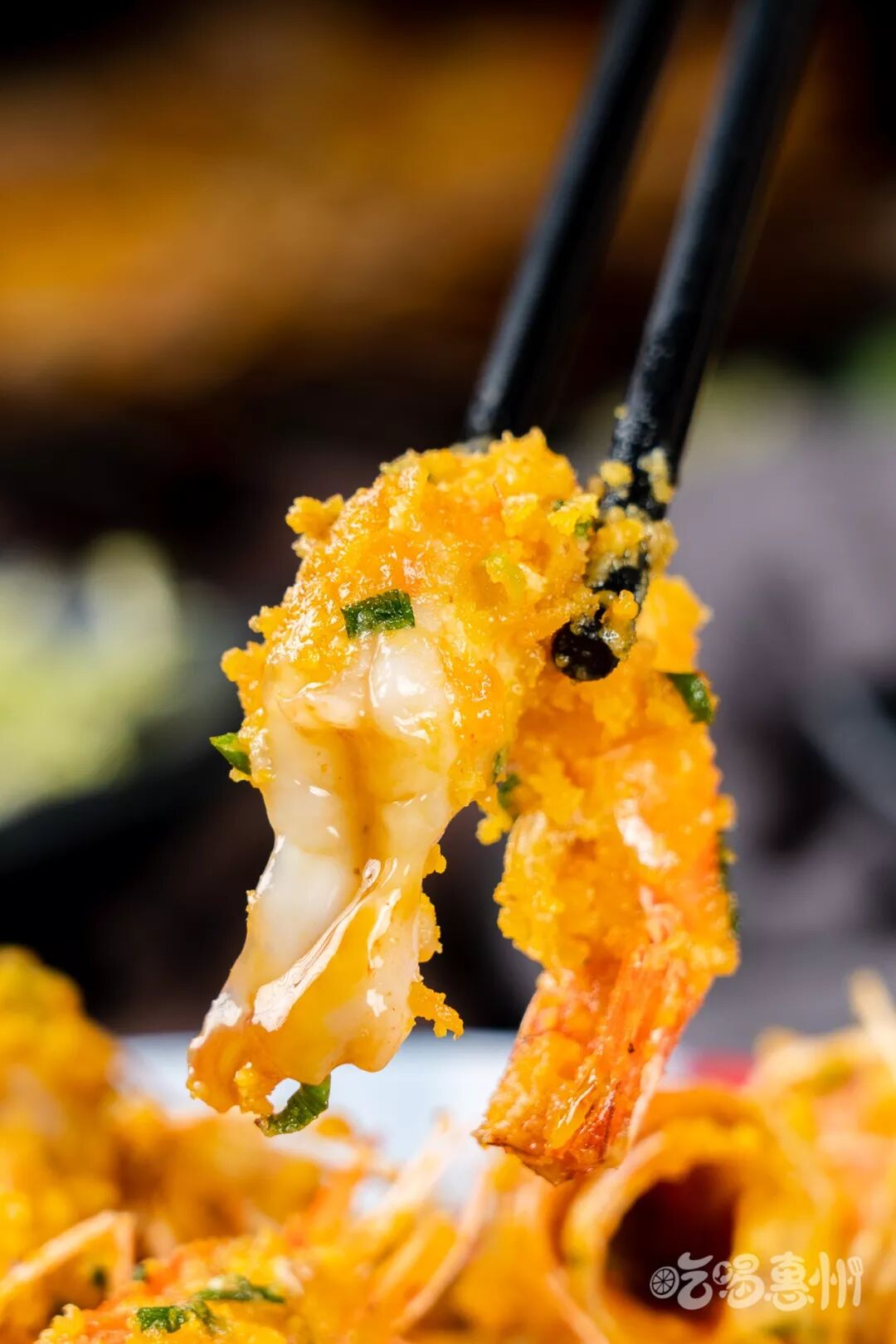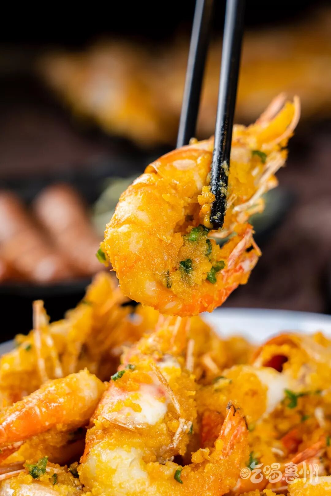 炸酥的大头虾虾壳可以直接下肚,再有裹上炒香的咸蛋黄碎,直接入口就很棒。