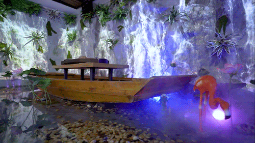 5D投影把洞庭湖风情引入店里,让人身临其境。湖水野鹤、荷花绿叶,云雾缭绕,弹琴泛舟,有种高山流水遇知音的感觉。每个进来的人,都会被它惊艳到。