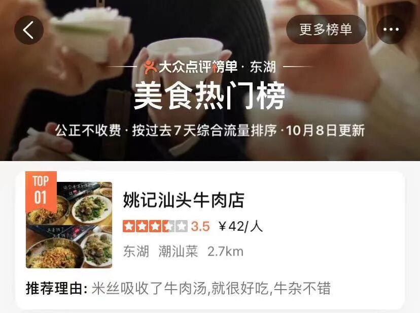 悄然之间,姚记汕头牛肉店就成为了东湖美食热门榜的TOP①。老板说他只是想做好自己的美食,没有想过宣传,但好在这样的“宝藏老店”还是散发了光芒。