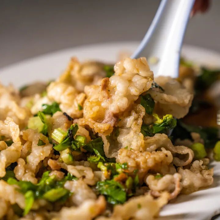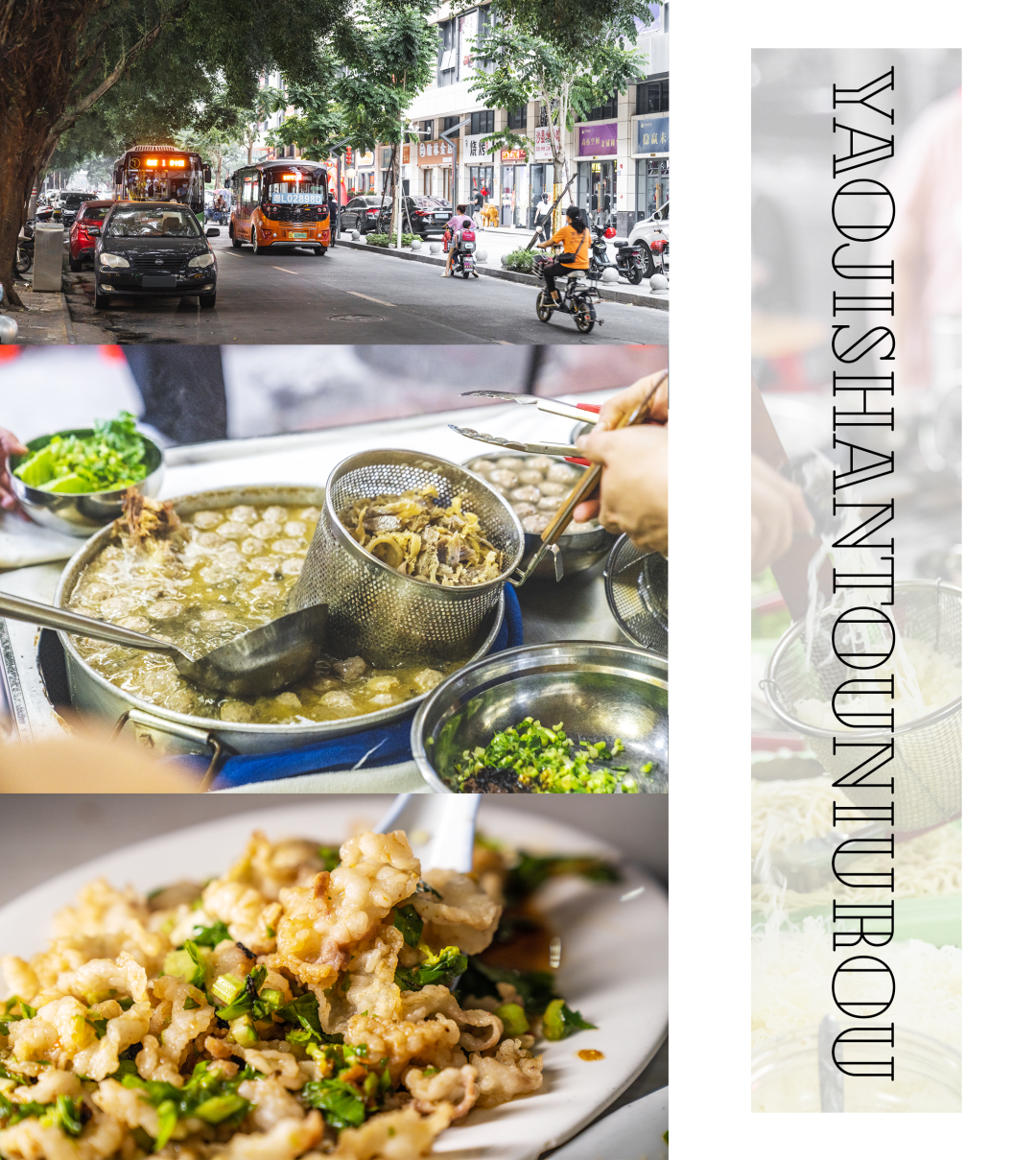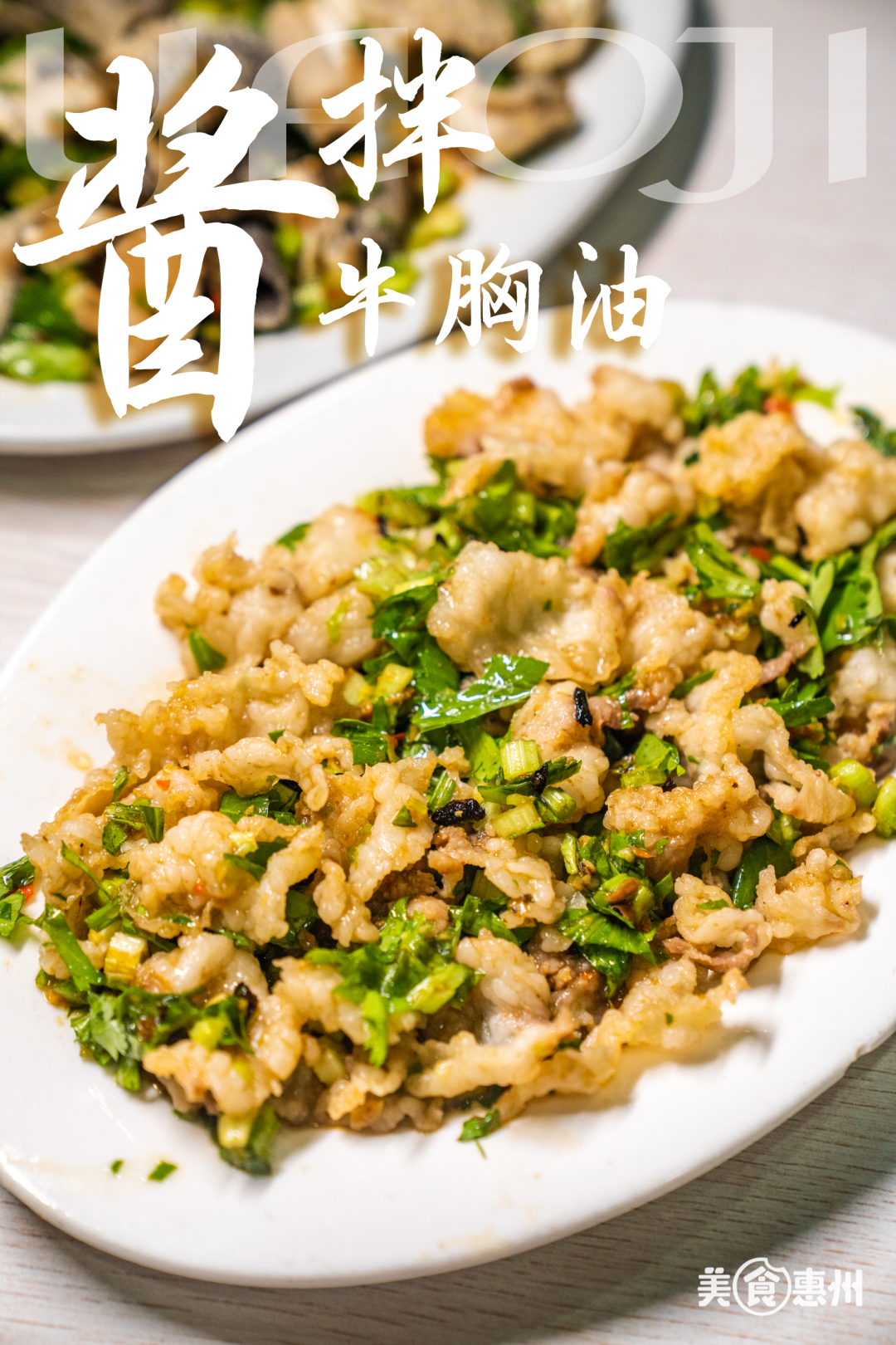 胸口油并不是肥油,而是靠近牛心脏部分脂肪膜,高温烫过之后呈现褶皱的纹理,更大程度的吸饱了酱汁。搭配拌料一起送入口中,香味就在舌尖四溢,牛胸油轻薄爽脆,值得一试。