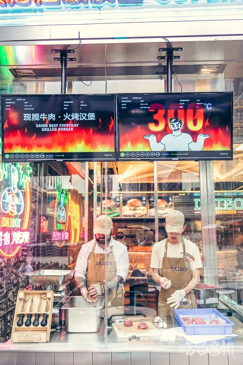 现在来呆男孩吃汉堡,会看到店门口这个透明玻璃的肉饼工作室,每天店里都会在这里把肉饼做好