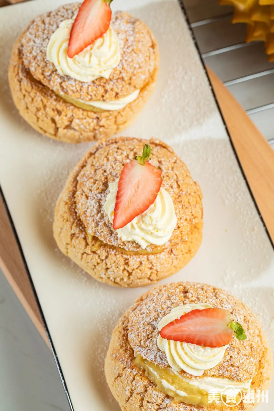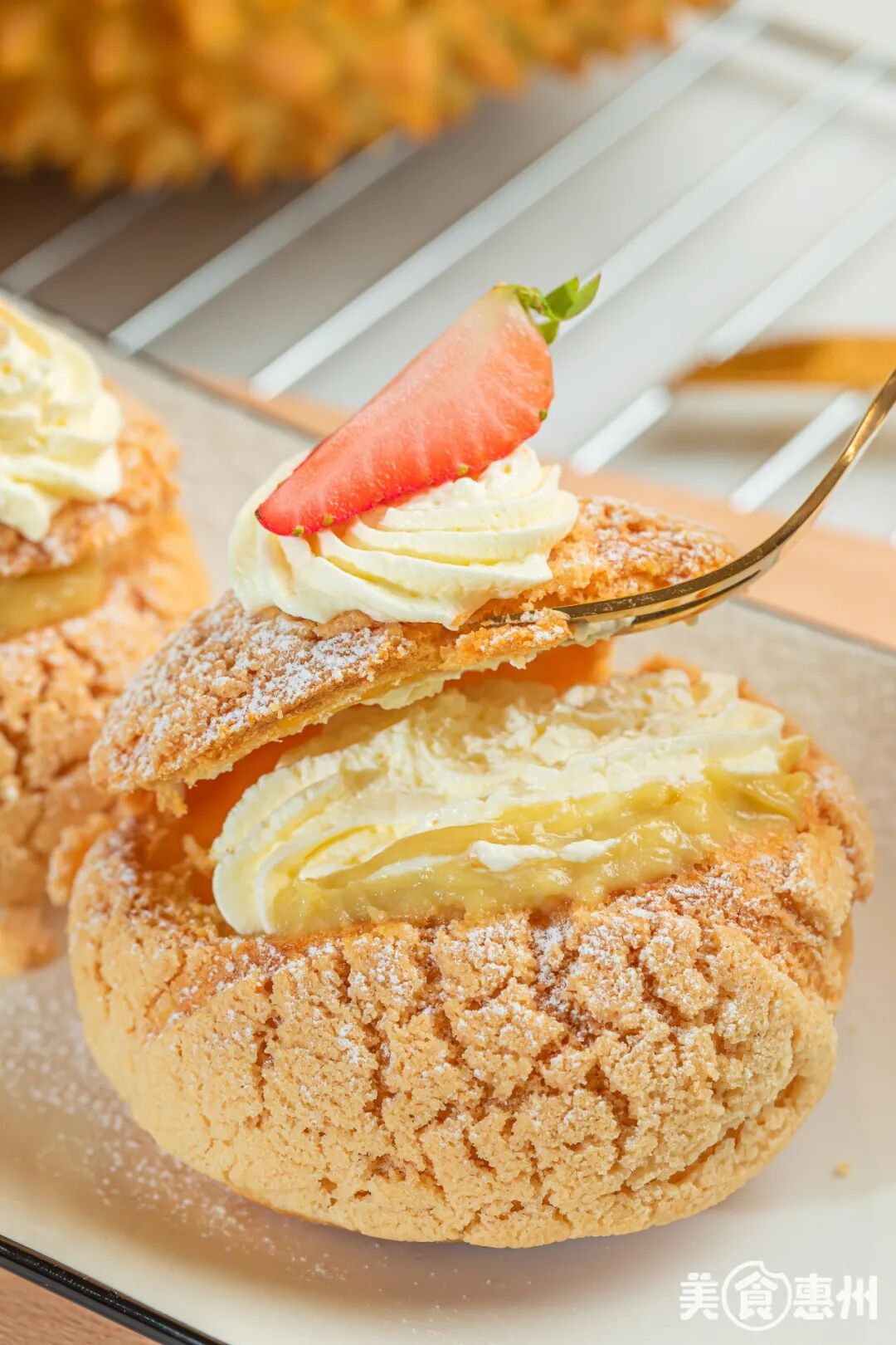 香酥的泡芙脆皮搭配鲜软的奶油,看得到的榴莲果肉与奶油交融更多了一些奶香,酥皮一碰就掉渣。酥与绵在舌尖各显魅力,榴莲的甜味成为了点睛之笔。