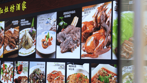 一进入红灶坊酒家,便能看到墙上的菜品一览,一菜一图,明码标价,时刻能够更清晰更方便地点菜。