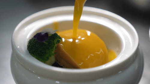 食材优选大连大鲜鲍,超厚的肉质吃起来口感十分厚实。金汤由新鲜的南瓜制成汁加入野米烩制而成,浓郁的金汤给鲍鱼赋予了更为高级的美味。