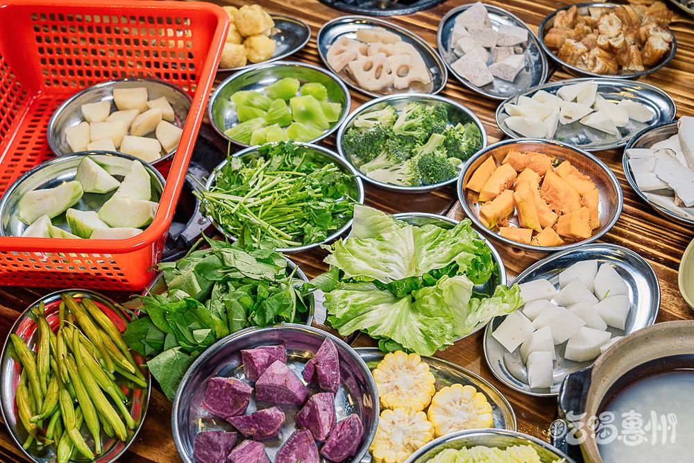 店里是自助火锅的模式,有专门的选购区域。200多种配菜,全部统一洗净分类放好。按碟计价,圆碟5元,不锈钢长碟10元,塑料长碟13元。