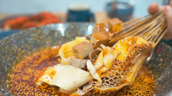 钵内配以红油汤底,菜品经过煮熟后,晾冷,放入汤底中,想吃即拿,接近口腔的温度,就是爽,(旋转旋转,更入味~)