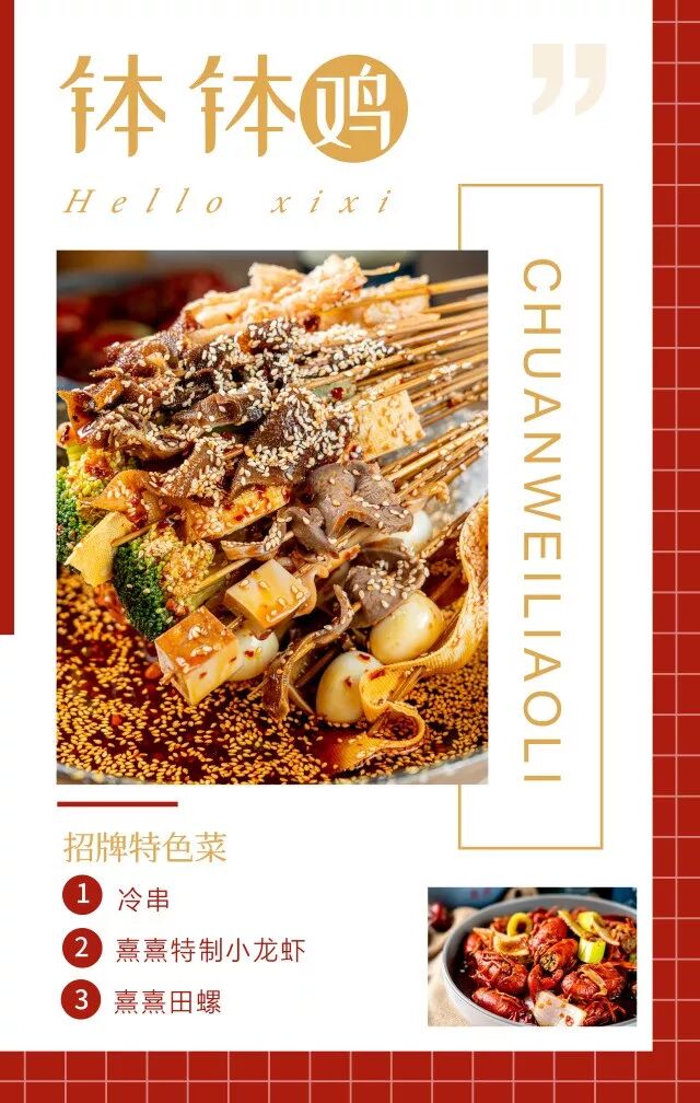 “钵钵鸡”的鸡,此“鸡”非彼“鸡”。“钵钵鸡”也叫红油冷串,是四川乐山的流行吃法。用竹签将食材串起,将选好的菜放入钵钵(就是你看到大碗哦)的汤底中浸泡入味,风味十足。