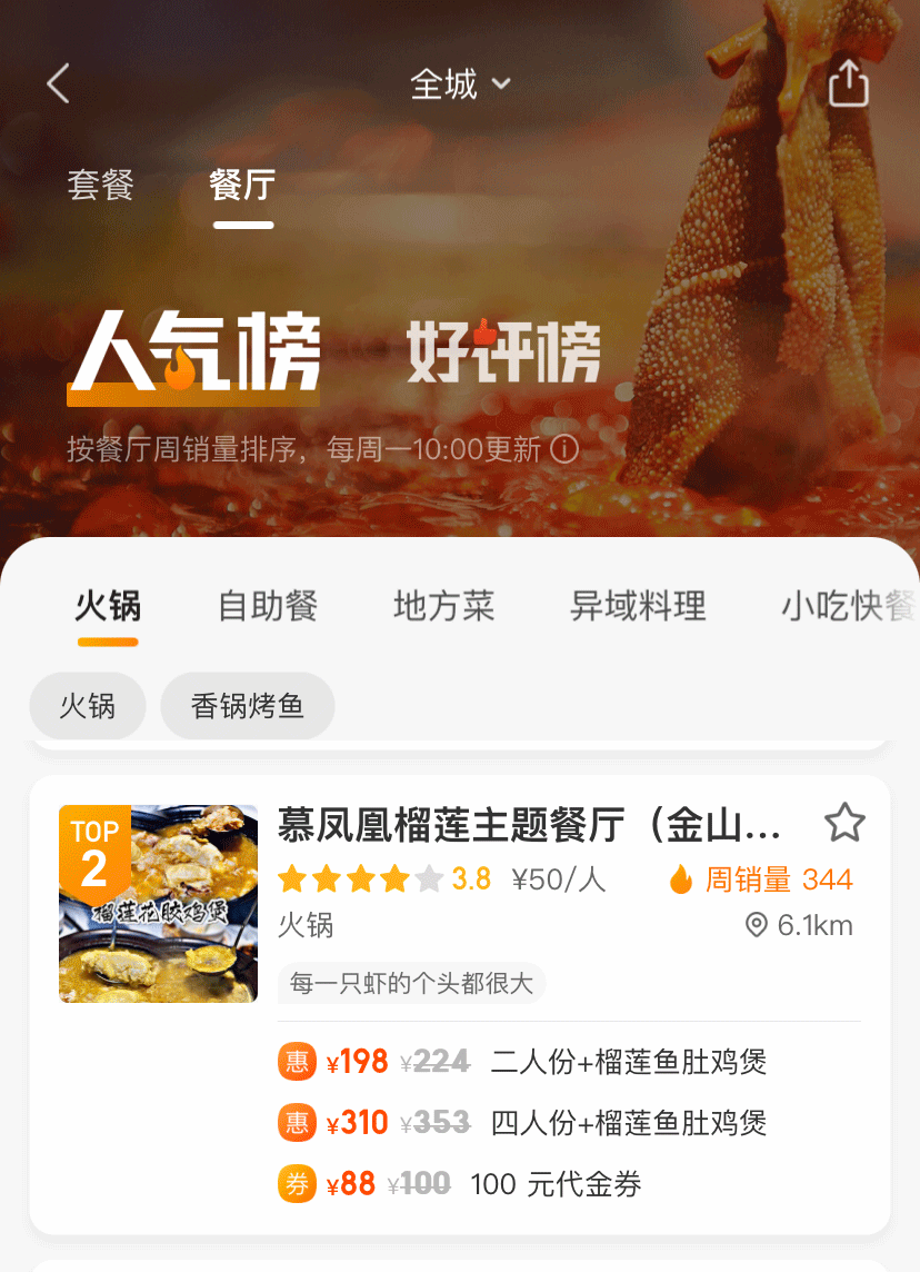 慕凤凰携超sup的榴莲鸡煲于7月份登陆惠州,仅仅用了两个月的时间就霸占了惠州火锅人气榜的第二位,不得不承认这人气真的爆到离谱啊!