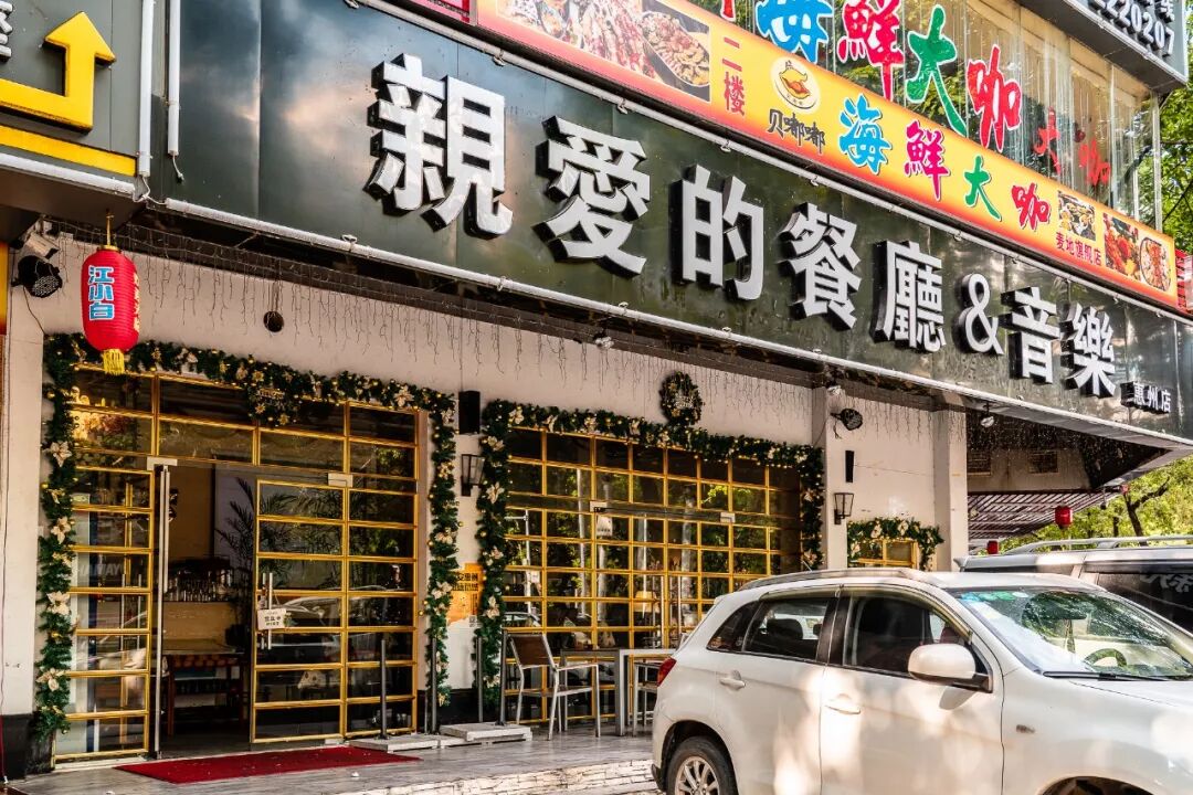 在餐厅外围还有一片灯火星河。当灯光亮起,点一杯小酒,坐在此处看街上人来人往,别有一番悠闲滋味