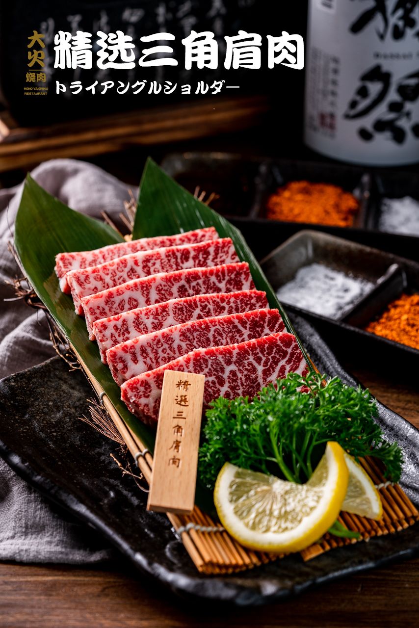 三角肩肉由牛第一根到第六根肋骨剔出的三角形部位特选M9级别和牛肉,肉质珍贵,淡粉色的牛肉中夹杂雪花纹路油脂,每一块都汁水充盈的样子。