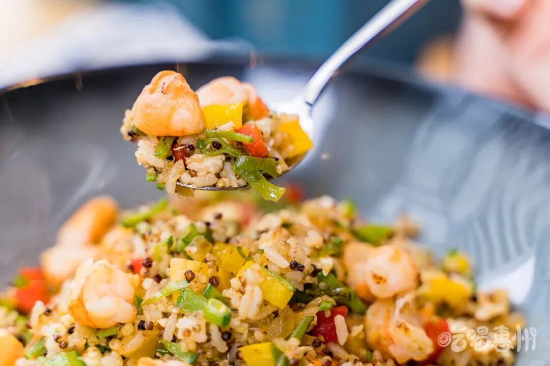 选用厄瓜多尔白虾,切成小段,配上彩椒块、荷兰豆粒、洋葱粒、蛋白混炒藜麦白饭,这个烹饪过程火候的把控和烹饪的技巧都恰到好处才称得上妙。