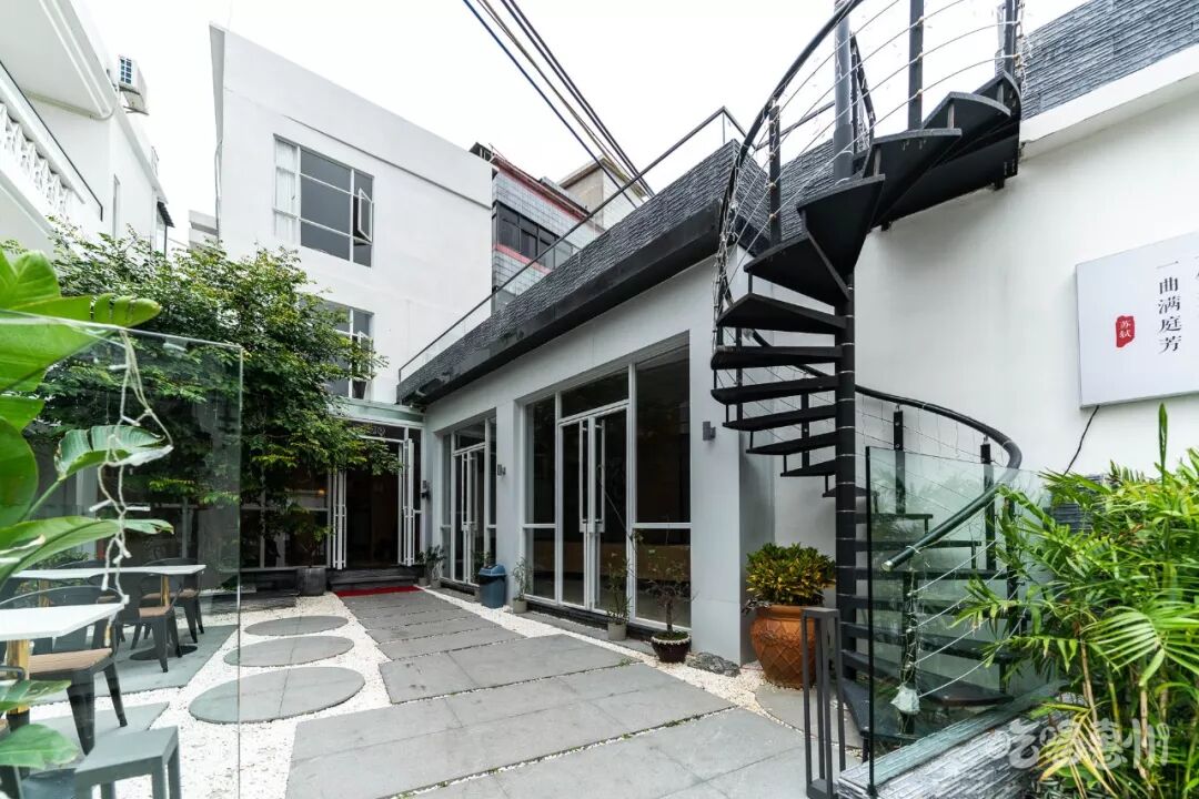 门外的旋转楼梯,看着特别有现代感,灰黑色的砖瓦和白色的墙面,清新雅致。