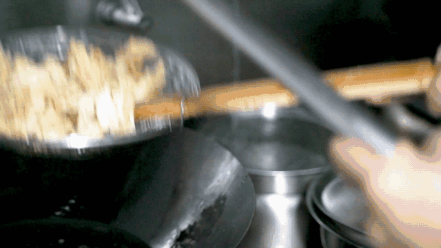 亲临厨房重地,可以很直接地感受到油锅的温度。油温一到,师傅立即抓起一把云吞,放入油锅,云吞在油锅里翻滚着。