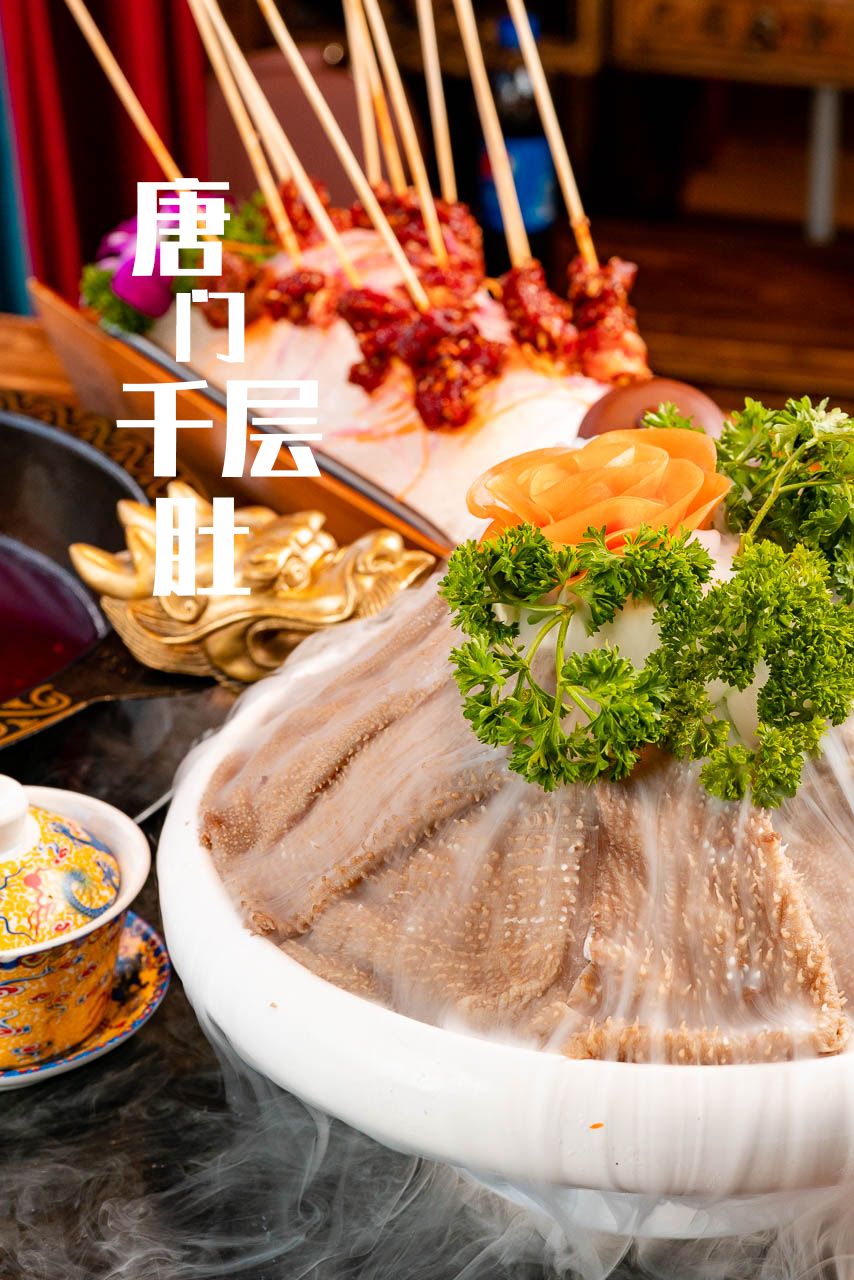 镇店之宝的唐门千毛肚选用的是高级毛肚,整体呈灰黑色,上头的颗粒感越多,说明毛肚越新鲜,吃起来口感格外不一样。