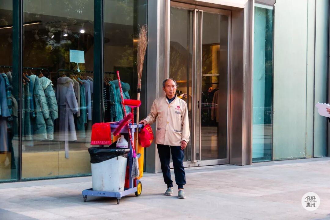 在商场外,我们看到了这位一直在低头认真扫地的大爷,在广场溜达的一段时间里,大爷打扫的身影一直出现在我们眼里。