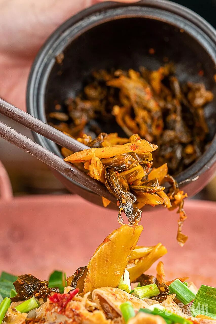 诶,别忘了,搭配的云南腌菜在滚烫的汤汁里涮一涮,入口酸爽,辣度适中,更让人食欲大增!