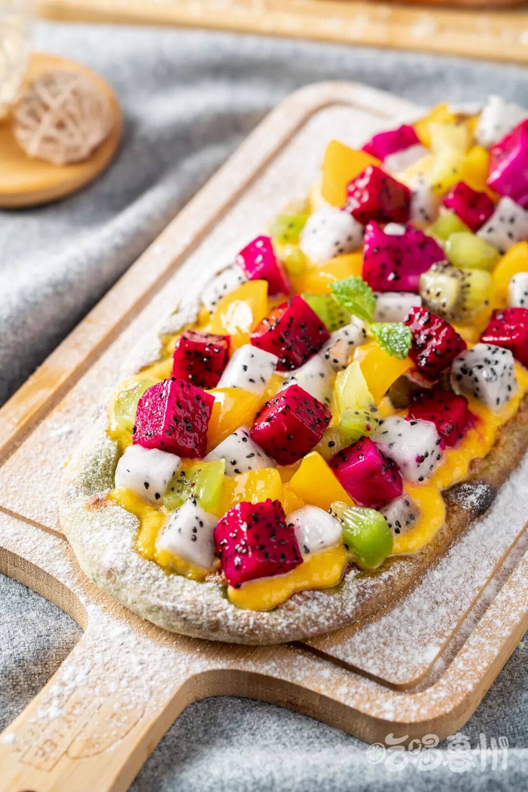 水果分量敲足,淡淡的抹茶香味薄脆饼皮,让整块披萨吃起来清新又香甜,一点也不腻。