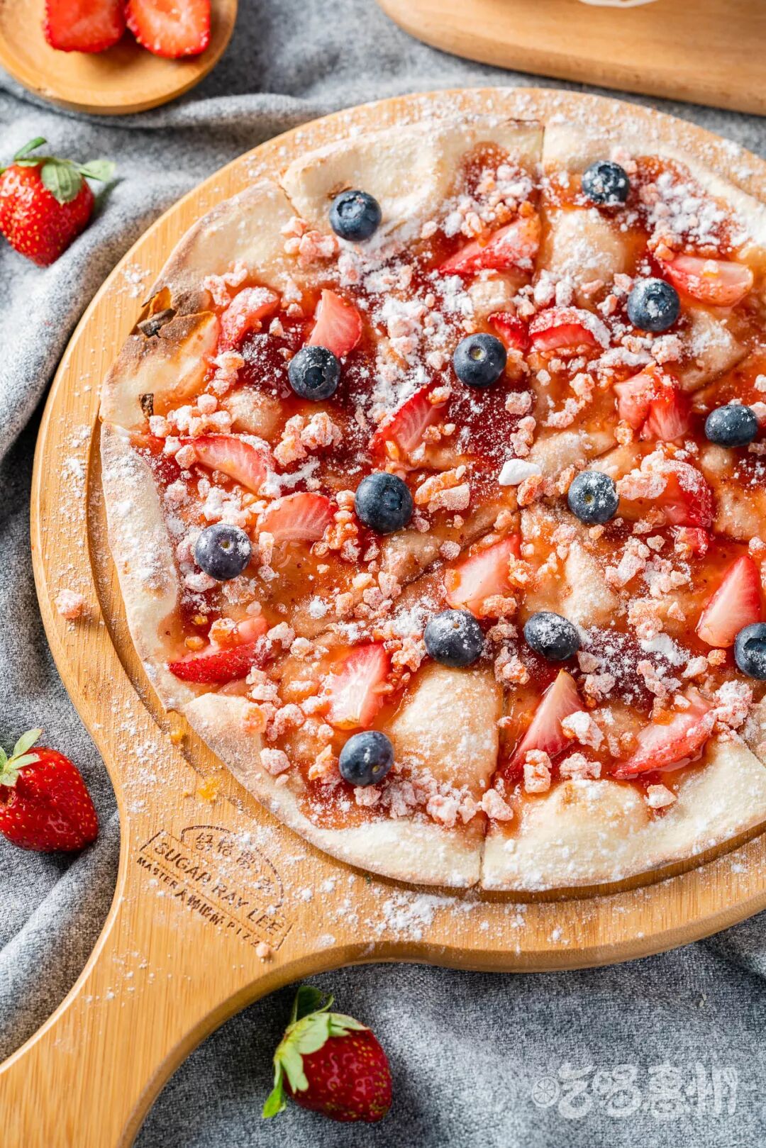 3mm的薄脆饼底,和一般水果披萨不同的是饼面铺的不是沙拉酱而是草莓酱,和蓝莓搭配得刚刚好。(单方面宣布草莓+蓝莓是恋爱的味道)