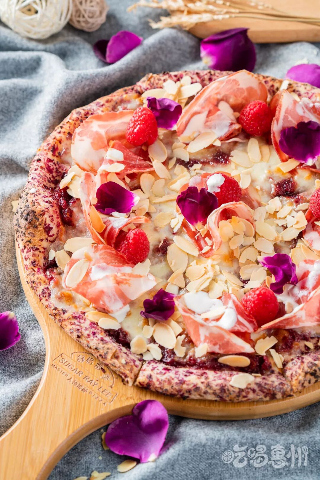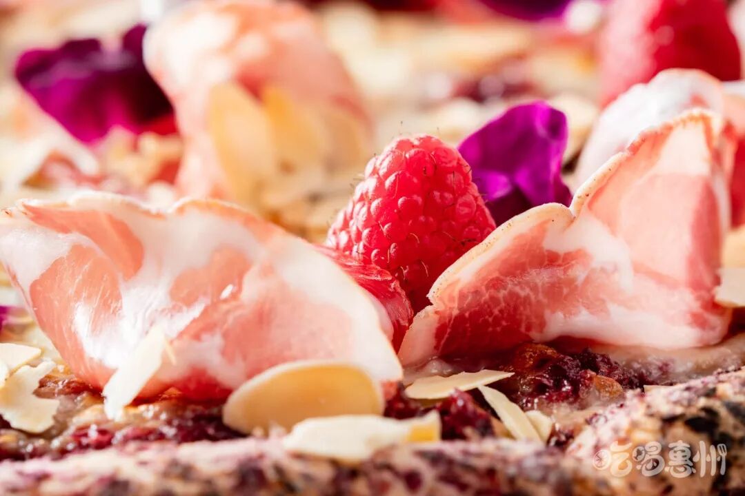 出炉后的披萨放上意大利火腿,造型像极了玫瑰花,最后撒上杏仁片、树莓和可食用玫瑰花瓣,连大直男摄影师都满怀少女心说:”好好看噢。“