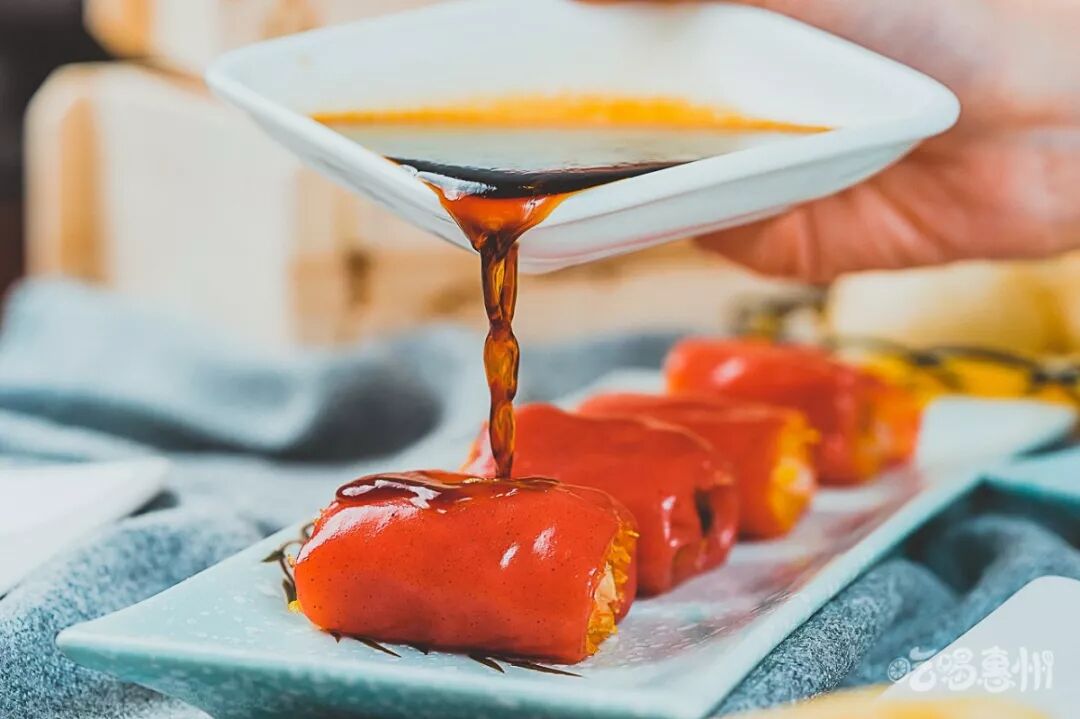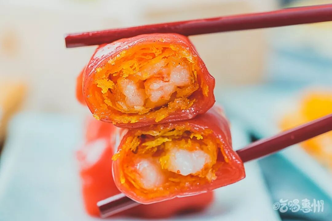 这粉红的是红米本身的颜色不要担心,里面包裹着虾肉和脆口的油条,淋上酱油趁热吃~