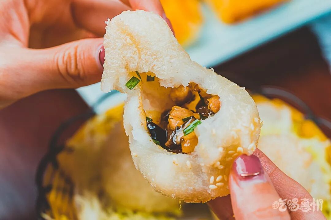 咬开香韧的外皮,里面包裹着喷香的馅料,有香菇、猪肉等等,味道被烹饪地口感相当醇厚。