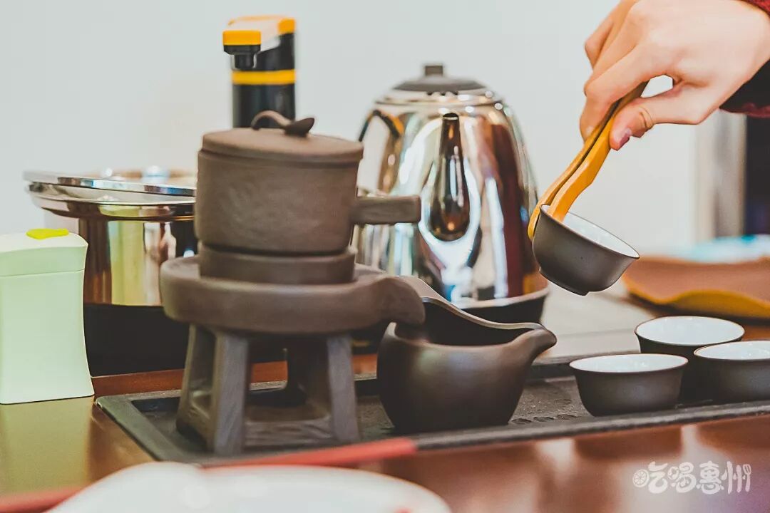 在这里吃茶点最特别的地方在于每个卡座位置上都会有自助式烧水设备,以及潮汕人“夹爹”的茶具。自助式泡茶,想怎么泡怎么来…