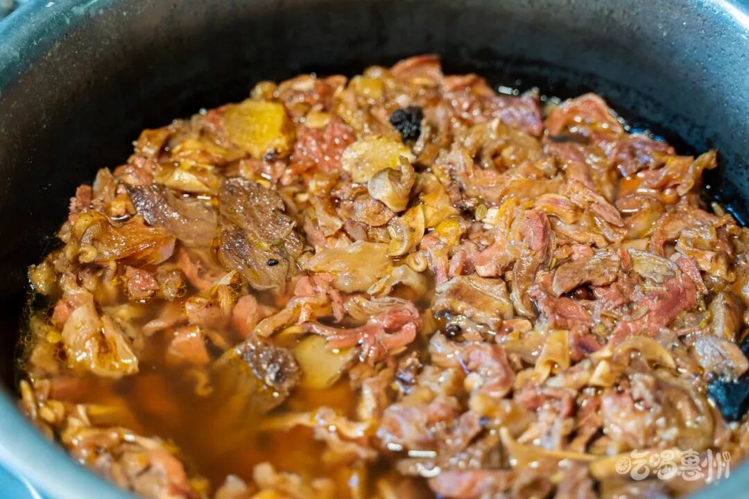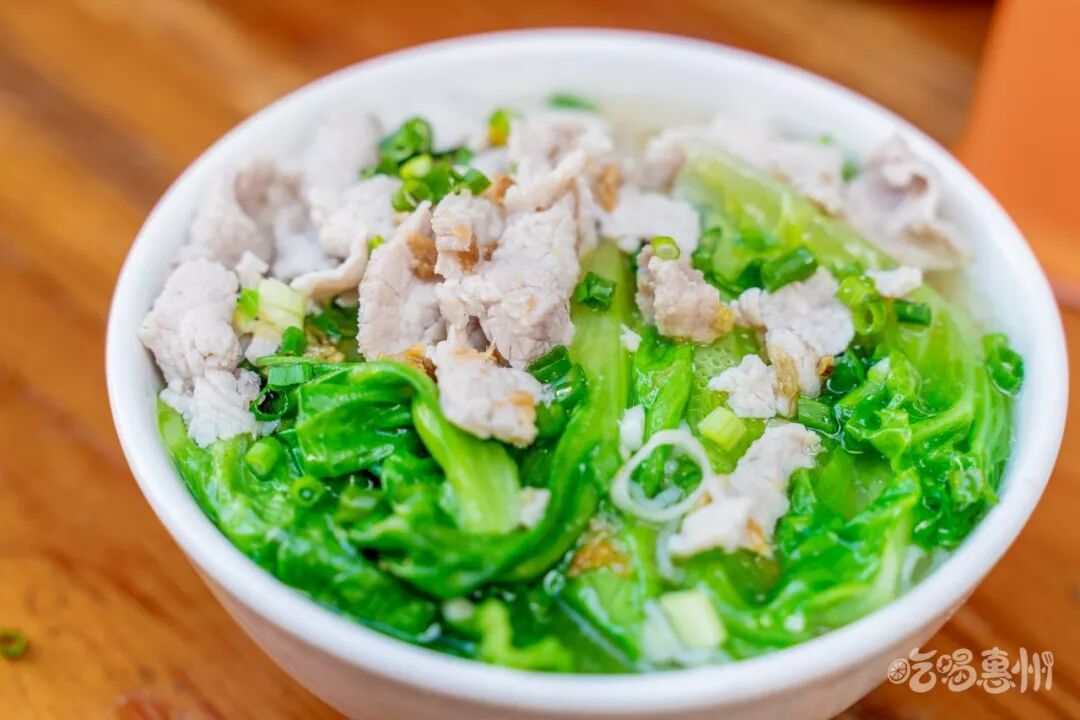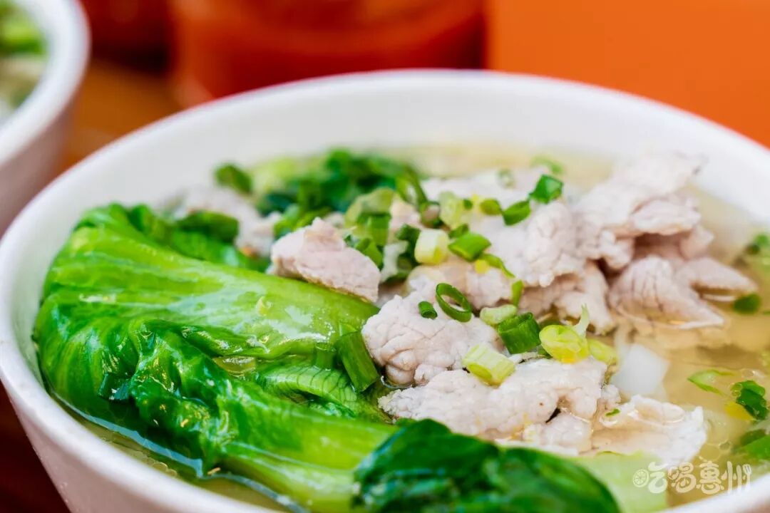 掀开锅盖,蒸腾的热气扑面而来,将粉面放入汤锅内烫熟盛入碗中,垫上青菜,撒点葱花蒜末(可不加),再舀一勺早已备好的猪肉加上。