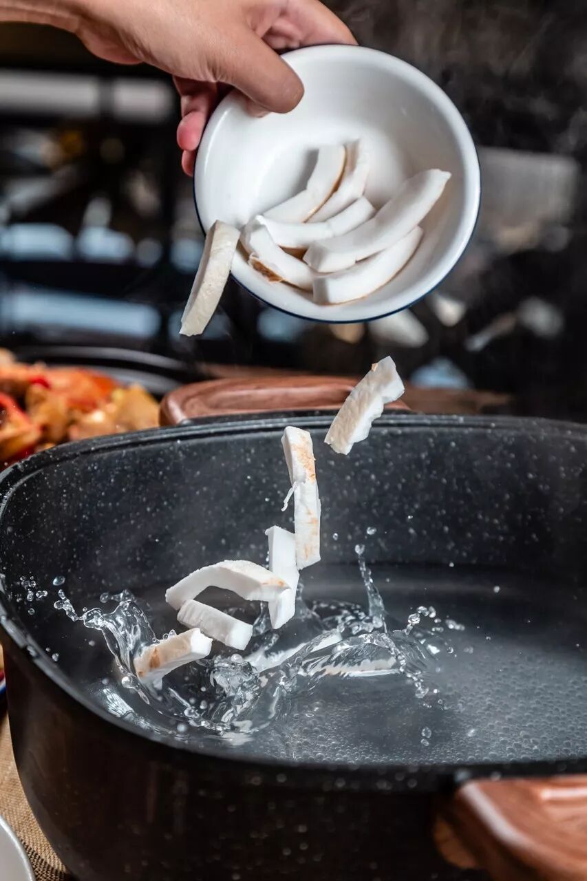 椰子鸡煲最突出的味道自然就是它独特的椰香味了,鸡肉在里面翻滚一番都能沾染上这张迷人的香气。