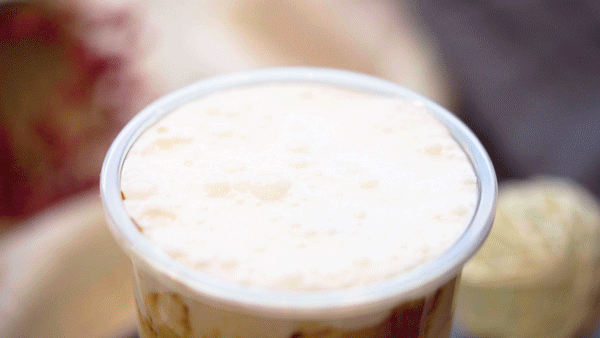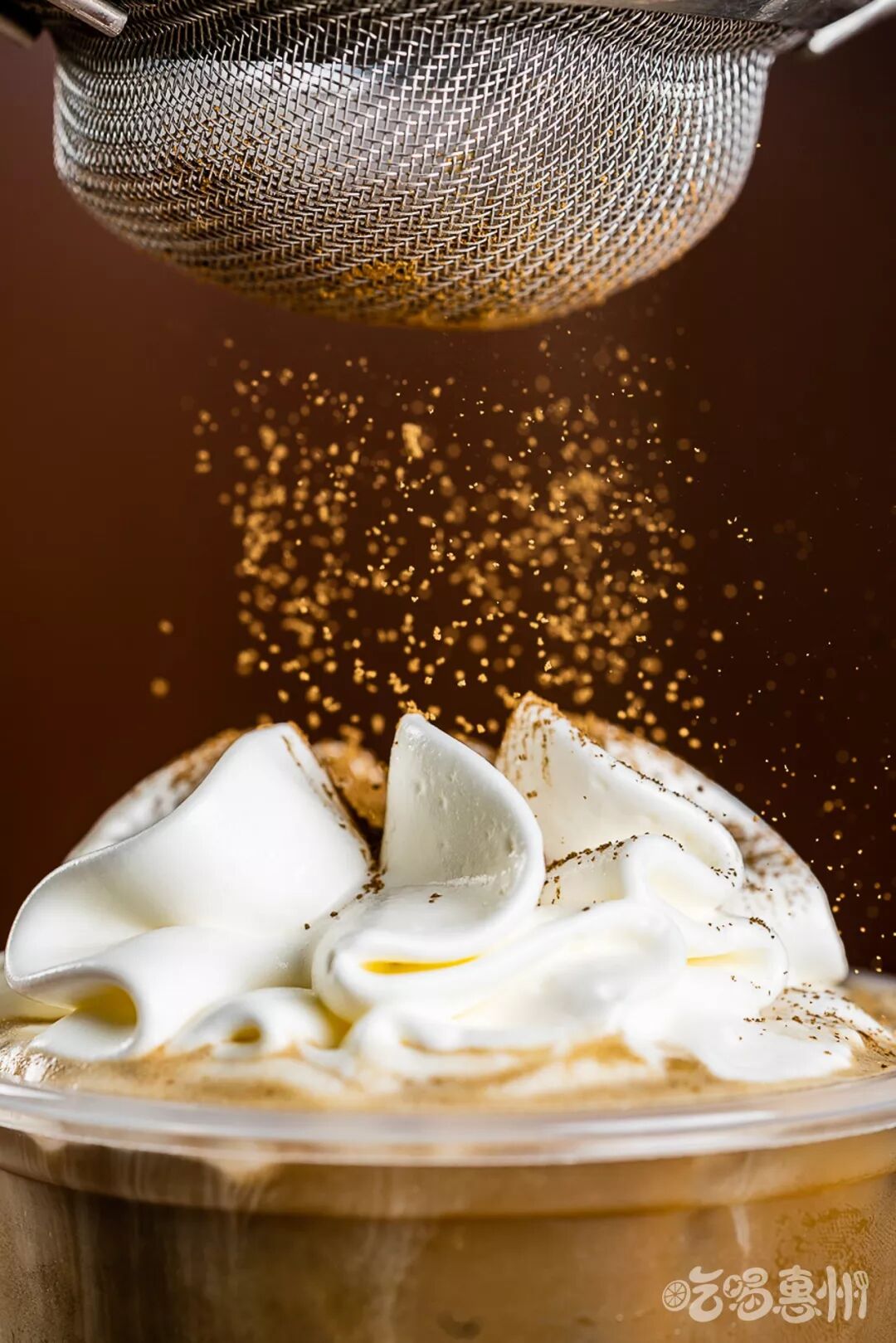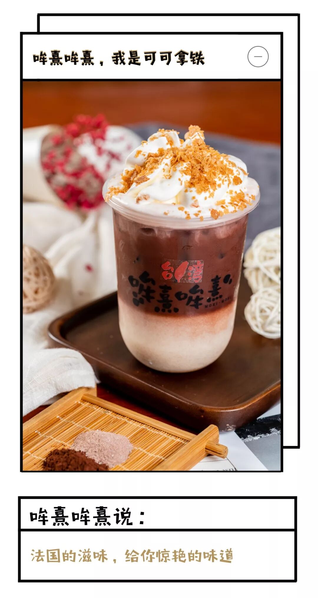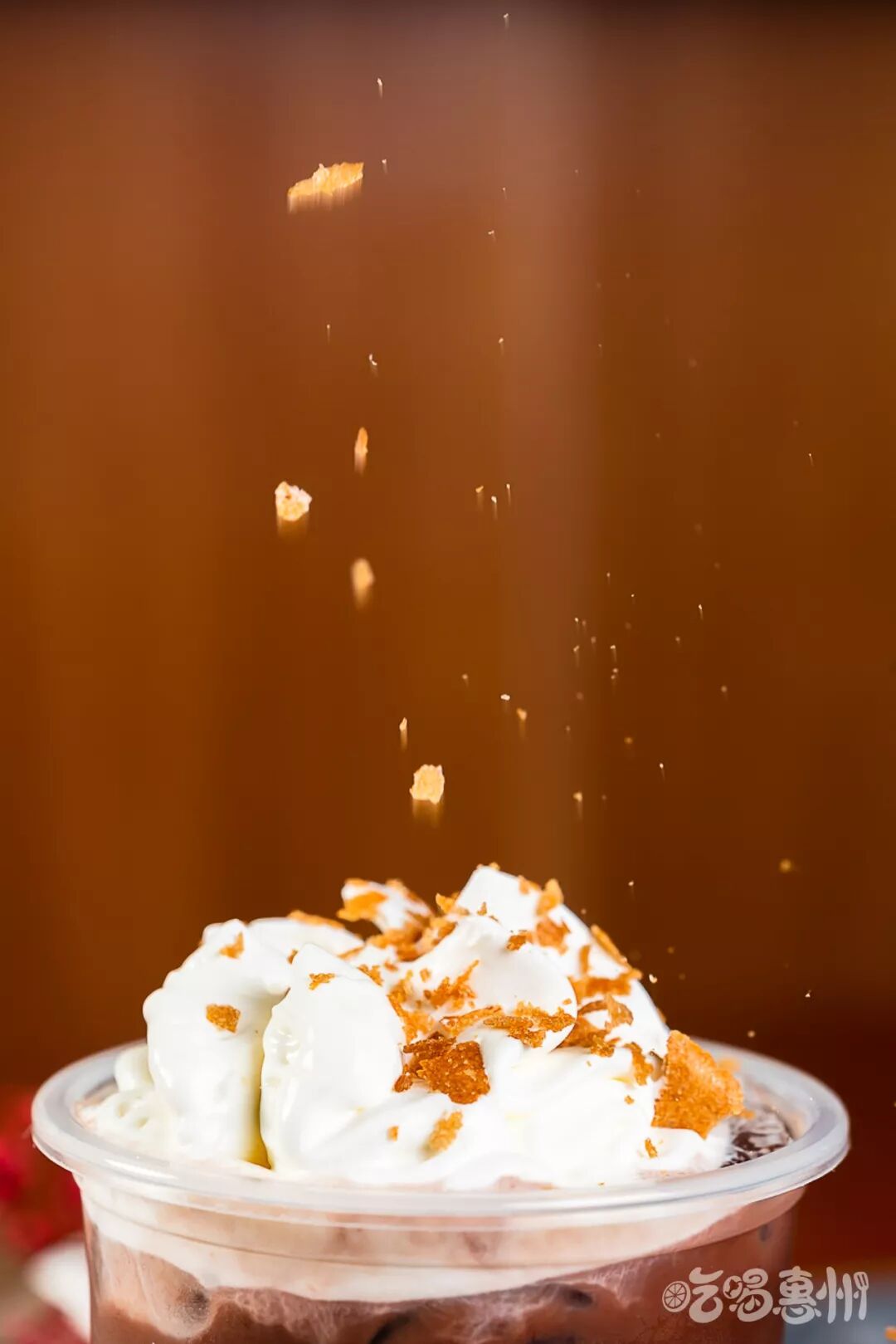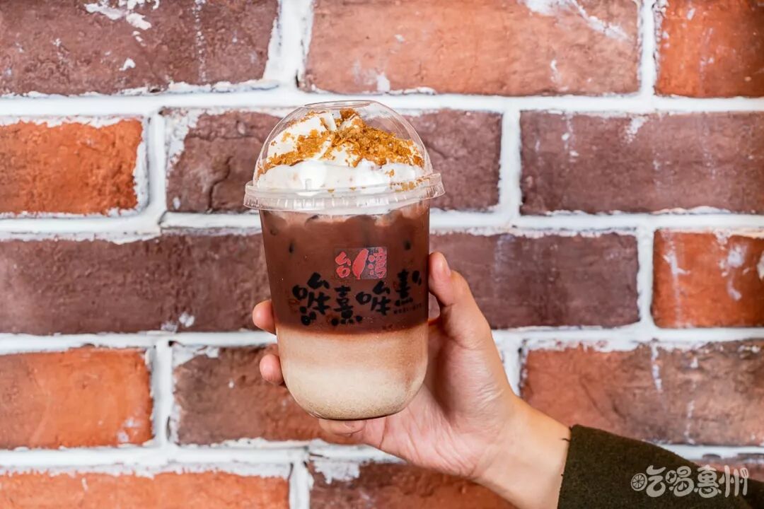 最后会在奶盖上撒上一层脆皮,让口感体验更有层次,喝一口,脆皮和奶盖以及可可拿铁夹杂在一起,超圆满的~